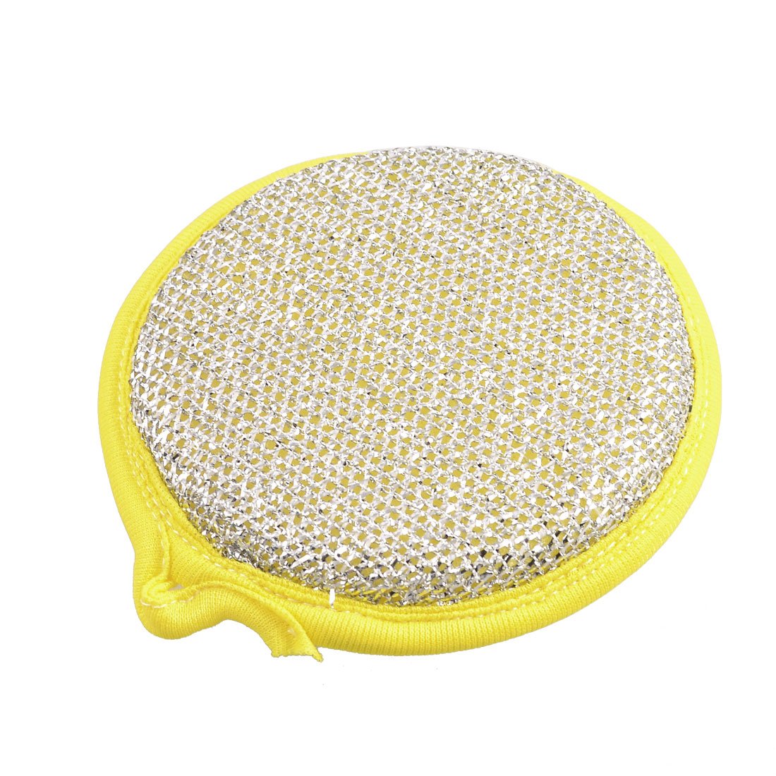 5" Diameter Yellow Edge Silver Tone Metallic Scrub Cleaning Pad is best for youThis Cleaning pad is constructed of metallis thread covered on the spong pad, ideal for bowls and dished cleaning use. Soft cloth design on the back, which will be comfortable for catching. Good water absorbtion design with spong pad inside. Great choice for housewife.