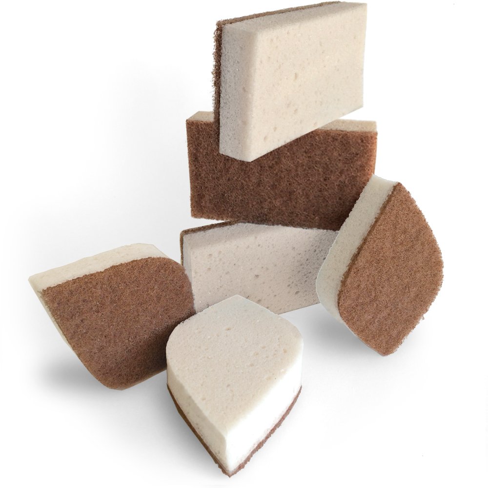 Pura Naturals Stink Free Cleaning Sponges Inhibit Bacteria. Stay Fresh NO ODOR Guarantee! Eco Kitchen / Household / Dish Sponges w/Walnut Scrubbers. 40x more durable. (Beige 6-pack | NO SOAP) is best for youWhat's the #1 source of germs in your house? It's your common kitchen sponge! Ewww! Bacteria per square inch: Dish towel=408, toilet seat=205, household sponge=134,630. There are 76 million U.S. bacteria illnesses each year. (Source WebMD) Pura Naturals is NOT your ordinary sponge. Not even close! We help the planet, plus over deliver on everything: GOOD STUFF WE GUARANTEE: -No stink guarantee -Resistant to bacteria & mildew -Non-toxic -Made from plant-based/renewable resources -Walnut shell scrapers pressed into sponge without glues -Highly chemical resistant -Lasts longer: 25x stronger than leading household sponge (UL Testing) -pH neutral -100% natural -Biodegradable -Ergonomic- Designed for hand comfort -Easier to hold -Pointed leaf shape for hard to reach areas -Dries quickly. Soft, unlike competitors dried cardboard look -Our manufacturing process removes carbon from the atmosphere, so consumers offset their carbon footprint with each purchase. -Cruelty free -Vegan -Handmade in the USA BAD STUFF WE LEAVE OUT. -NO Petroleum -NO Gluten -NO Latex -NO Artificial colors & fragrances -NO Petrochemicals -NO Parabens -NO Phthalates -NO Synthetics -NO Toxins -NO Adhesives -NO Glues -NO Animal products (vegan-friendly) -NO Animal testing (cruelty-free) -NO GMOs -NO Synthetics -NO BPA Doesn't your family deserve a sponge that does the job while keeping your environment & family safe? HOW TO USE Activate your Pura sponge with water & squeezes. When done rinse & air dry. HOW TO GET STARTED Evict bacteria from your home today. Add our sponge packs to your Amazon cart.