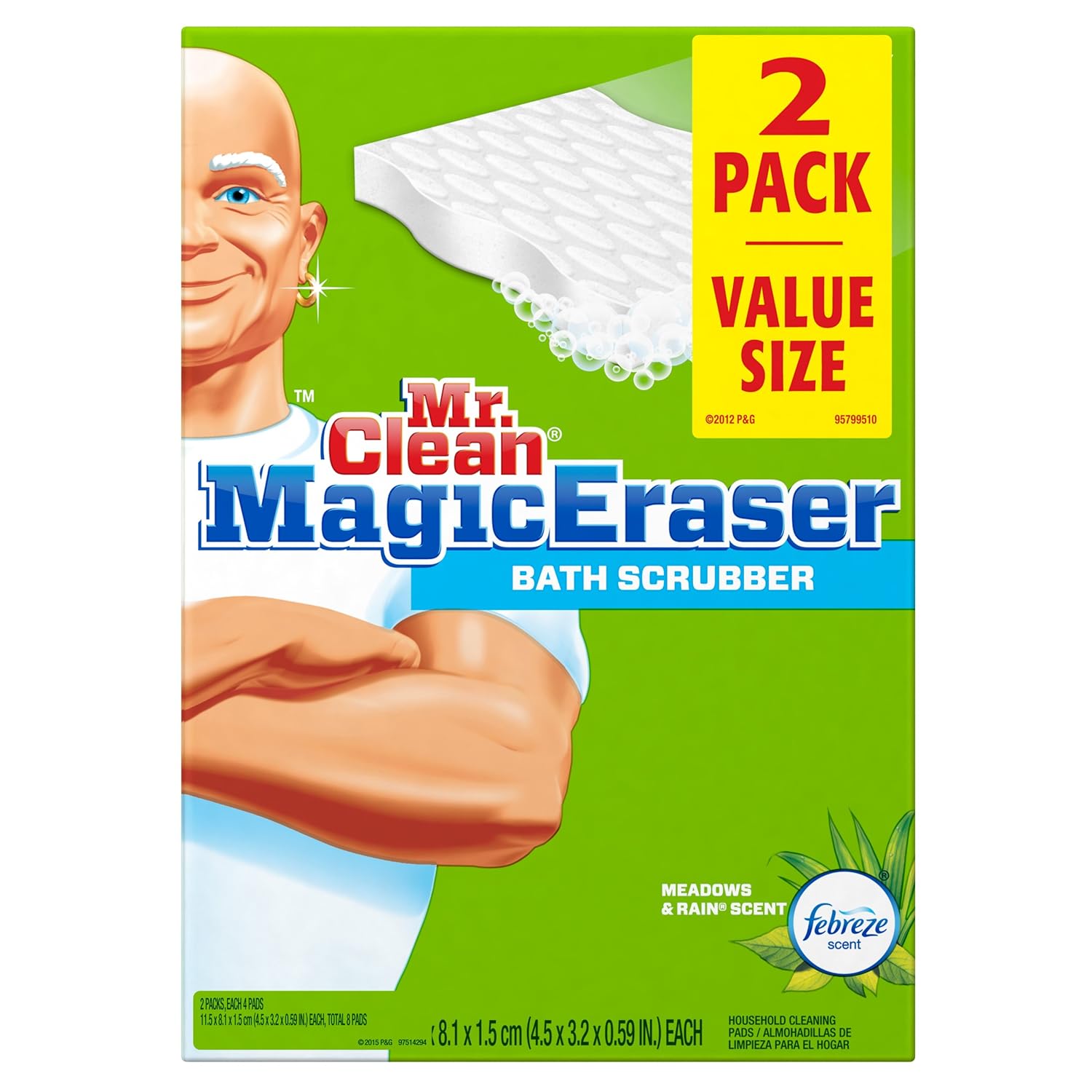 Mr. Clean Magic Eraser Bath, 8 Count is best for youThe build-up of tough soap scum on your sink, shower and tub can quickly transform your bathroom from shiny and clean to dingy and grimy. Getting your bathroom hard surfaces sparkling again, however, doesn't mean hours of backbreaking work when you use the soap scum fighting power of Mr. Clean Magic Eraser Bath Scrubber. Mr. Clean Magic Eraser Bath Scrubber cleans more soap scum per swipe. The Eraser pad has a 30% larger and more durable scrubbing surface vs. the Magic Eraser Original. Mr. Clean Magic Eraser Bath Scrubber tackles bathroom build-up easily vs. the leading all purpose bleach spray cleaner.
