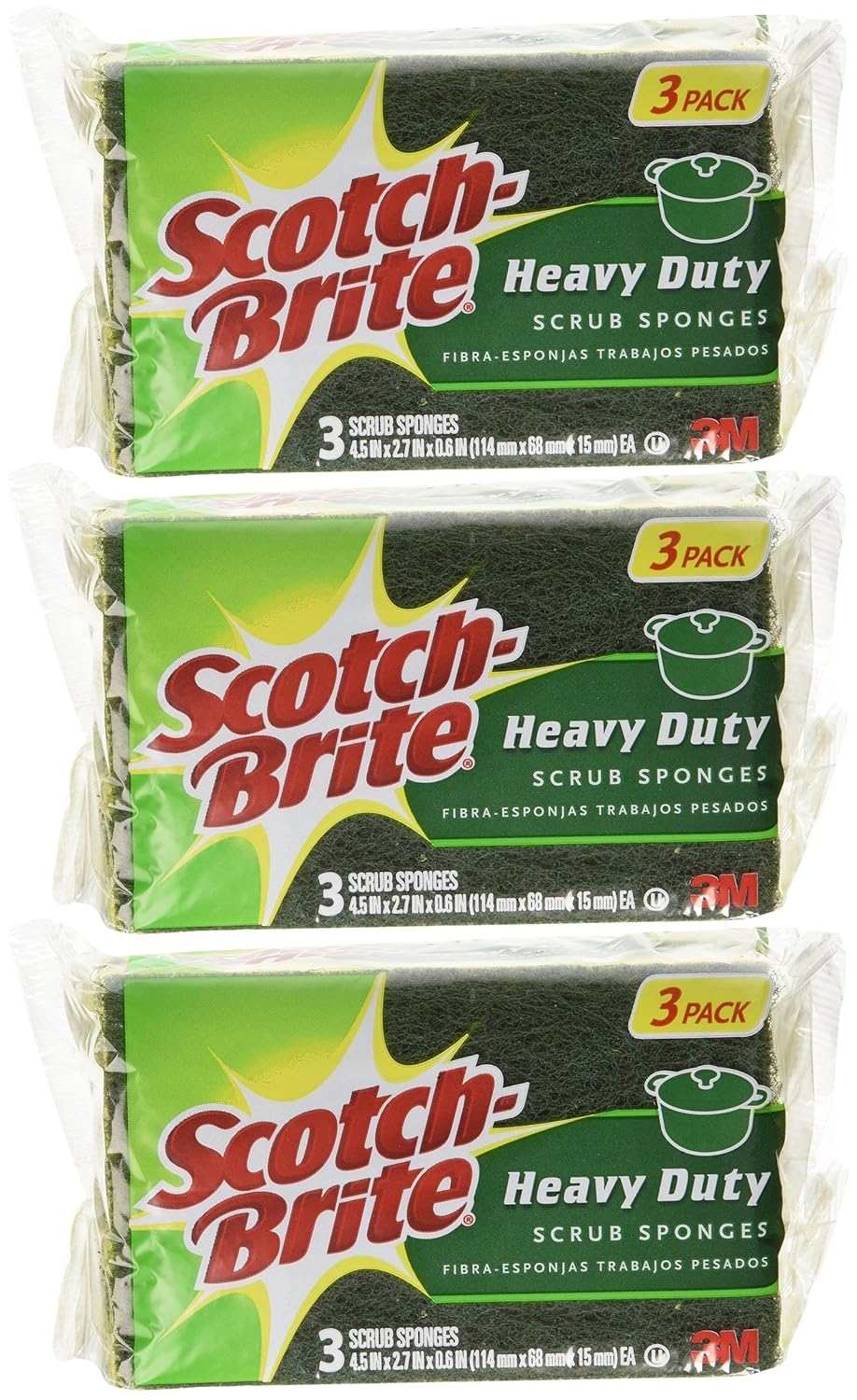 Scotch-Brite Heavy Duty Scrub Sponge, 3-Count (Pack of 3) Total 9 Sponges is best for youReach for the Scotch-Brite(R) Heavy Duty Scrub Sponge because sometimes the mess is just too tough for a regular scrub sponge. From grunge on the grill, to pots and pans that sat overnight, get it done right! Look for heavy scrubbing power also available in a large size for your toughest messes.