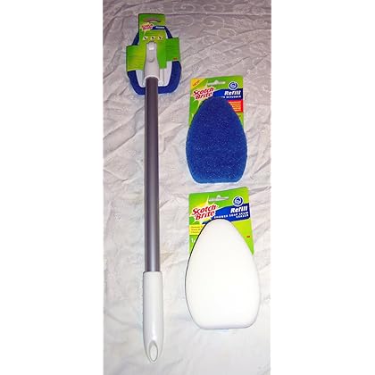 3M 549 Scotch-Brite Bath and Shower Scrubber With 2 Replacement Heads is best for youRemoves soap scum without scratching Replaceable cleaning heads Heavy duty handle extends up to 2 feet Two replacement heads (1 blue scrubber and 1 soap scum eraser!).