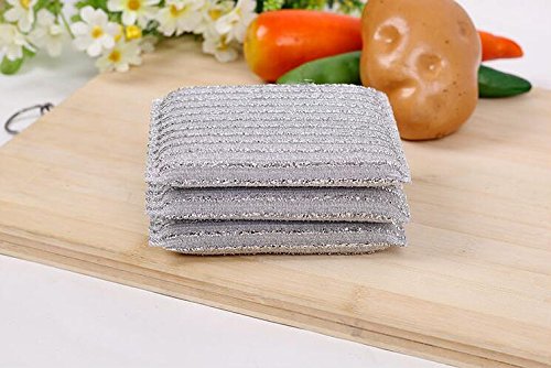 Kocopoo New Light-weight Steel Wire Sponge Cleaning Scouring Pad,Dish Scrubber For Tableware, Kitchenware Cleaning (High-quality,Not Hurting Hands,3 pieces) is best for youthis is a new generation scouring pad. it,s easy to use,don,t hurting hands like the ordinary cleaning steel wire ball and scouring pad. Compare to the ordinary one A typical dish sponge, scrubber or cotton dish cleaning scrubber builds up bacteria the minute you start using it. After a few uses it stinks and you have to waste time, resources and energy into cleaning a ordinary sponge. Features The All Purpose Scrubber Pad solves all that and works majestically. It does not stink even after months of use. Just rinse cleanly under running water and let it air dry. Very low maintenance required. The All Purpose Scrubber Pad is gentle enough for all non-stick and stainless cookware yet strong enough to scrub away big messes. It leaves items sparkling clean without any scratches or marks. 100% non-scratch. Safe for stainless, Tupperware, cast iron, non-stick coated, glass, china, porcelain, plastic. The unique soft bristles from our specialty yarn gets rid of difficult stains and gets into hard to reach places. What's more, food rinses out easily - even eggs and melted cheese. No Odor No more smelly sponges or mildew odor in your kitchen, plates or counter top again. The All Purpose Scrubber is designed specifically not to absorb water so that it air dries fast and will not smell even after months of use. To clean, just rinse under running water or pop it in the dishwasher or washing machine to sanitize. The All Purpose Scrubber is triple stitched to reinforce strength and durability. The All Purpose Dish Scrubber Wide usage Clean dishes, bowls, tiles, pans, glasses, milk bottles, vase, cup, mugs or other kitchenwares.Can be used to clean oil, grease, dirts on your bowl, cup, dish, etc.Compact and lightweight.