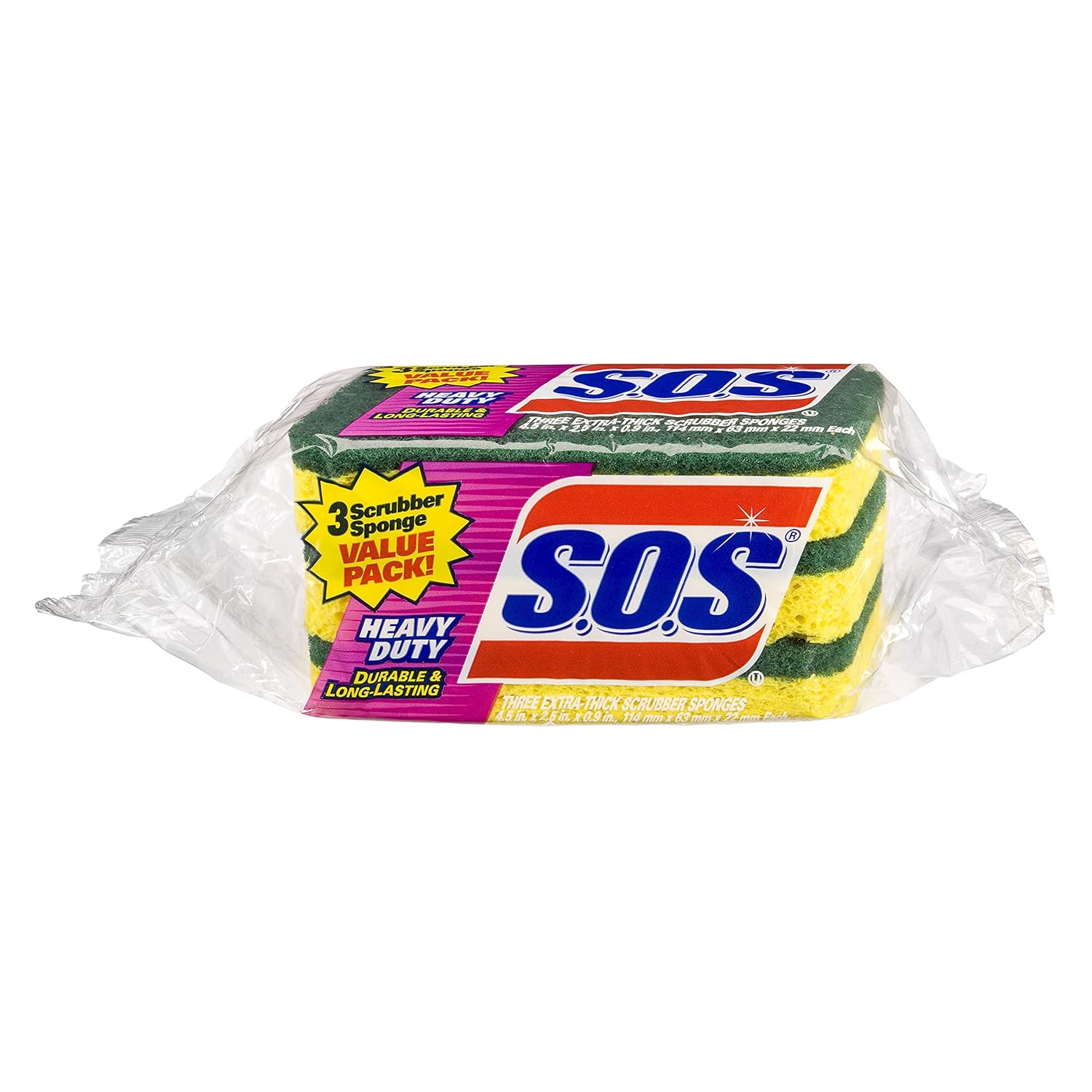 S.O.S. Heavy Duty Scrubber Sponge, 3 Count (Pack of 8) is best for youFor tougher jobs, the S.O.S Heavy Duty Scrubber Sponge is the ideal kitchen and bathroom cleaning tool. Use it to quickly wipe down countertops and sinks or scrub away tough messes on the stove or in the oven. Durable, absorbent and longlasting, SOS heavy duty scrubbers are bigger and thicker than most ordinary sponges. With its specially angled shape,this sponge makes it easy to access all those hard-to-reach nooks and crannies.