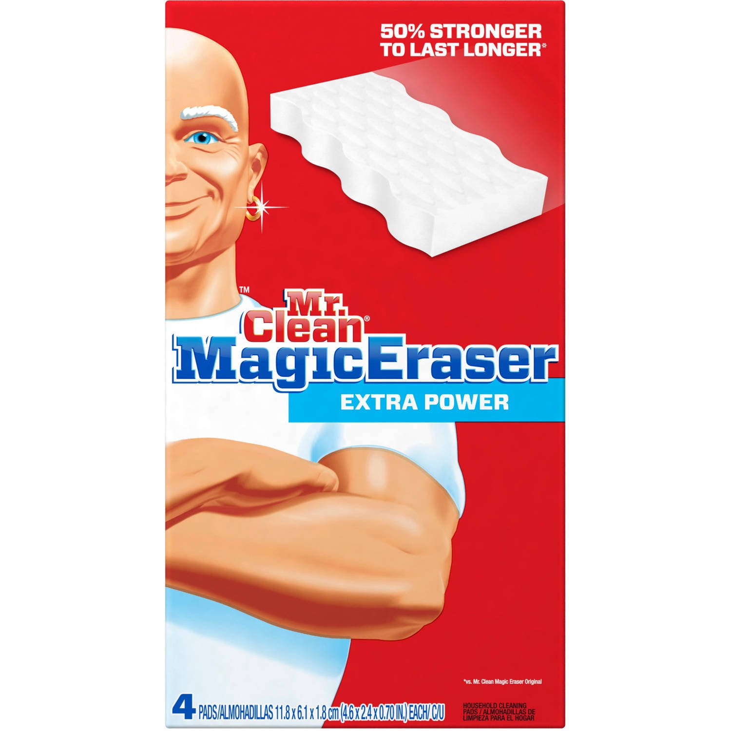 Mr. Clean Magic Eraser Extra Power Household Cleaning Pads, 4 count , Looks Like A Sponge, Cleans Like Magic. is best for youMr. Clean Magic Eraser Extra Power Household Cleaning Pads are 50% stronger to last longer vs. Mr. Clean Magic Eraser Original. The cleaning pad's micro-scrubbers reach into the surface grooves, lifting away built up dirt and grime. Mr. Clean Magic Eraser Extra Power Household Cleaning Pads are so tough they remove more grime per swipe vs. the leading all-purpose bleach spray cleaner. Use them on textured surfaces, plastic patio furniture, alloy car wheels and so much more.