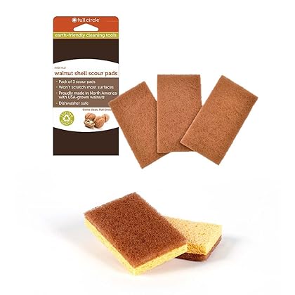 Full Circle Walnut Scour Pads and Scrubber Sponges, 5-pack is best for youTransition to a cleaning alternative that leaves less of an impact on the environment. These unique scour pads and scrubber sponges from Full Circle are made of plant-based cellulose, upcycled walnut shells and recycled plastic.More gentle on the environment that traditional synthetic sponges, these scour pads and scrubber sponges are ready to clean up your dirtiest jobs-from dishes, to sinks, toilets, showers and more. The scour pads are filled up organic scrubbing power, while each scrubber features a walnut shell-based abrasive side for tough jobs, absorbent cellulose side for general cleaning. Plus, when they get really gross and it's time to clean up the sponges and scour pads, they can be renewed and refreshed just by tossing them in the top rack of the dishwasher-voilĂ .And, there's even more good news. While these scouring pads are made from nut materials, you'll be able to safely use these multi-purpose scrubbers without having to worry about causing an allergic reaction.We have faith these little guys will be tough on mess but soft of surface, but just to be safe, always text a small area of you cookware or countertop before using the scrubbers or scour pads on new surfaces. Sustainably made in Canada. Size: Each scour pad measures 5.5'L x 3'W, Each sponge measures 4.375'L x 2.75'W x 0.75'H.