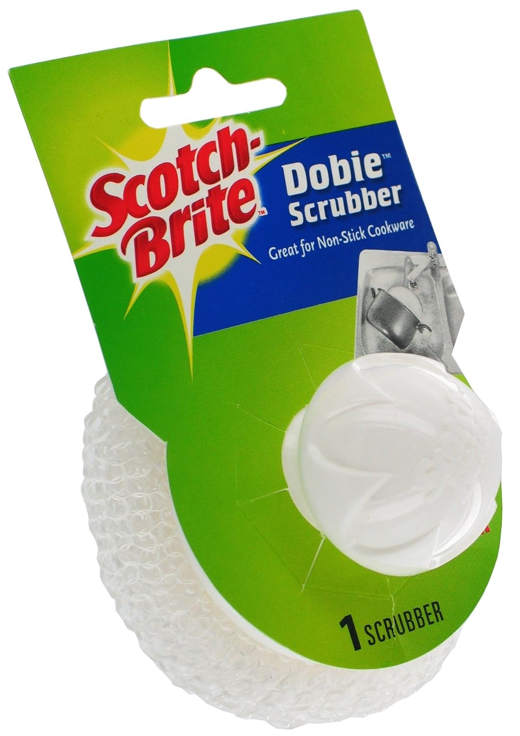 Scotch Brite Scrubbing Pad (White or Blue Plastic Pad) is best for youDobie Scrubber with built-in handle. Great for non-stick cookware! (1) Scotch Brite Scrubbing Pad (White or Blue Plastic Pad) *Random Colors Shipped*.