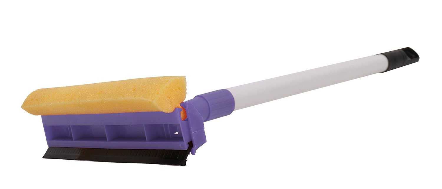 window washer with premium grade microfiber and a Power Scrub Strip that cleans glass and windows quickly and easily. The large, flat cleaning surface combined with the premium microfiber and Power Scrub Strip removes dirt faster than other window cleaners with curved or rounded cleaning surfaces.wide squeegee with metal scraper. Use the rubber squeegee blade to remove water, prevent water spots, or use it as an applicator for grout and adhesives. The curved metal scraper holding the rubber blade can be used to scrape off tough dirt and grime.the 8" Window Squeegee Washer Scrubber Cleaner Wiper with 19" Long Handle for Auto or Home (Blue) The squeegee handle will insert and lock into the washer handle, so that both tools can be nested together. Nest them together facing the same way for quick cleaning, nest them together facing opposite directions for more control and room to clean, or separate the two tools to use each on its own.
