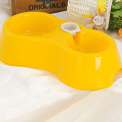 CALISTOUS The Cat And Dog Food Feeder Tool Pet Double Bowls Yellow is best for youFeatures: Brand new and high quality. Ideal gift for your pets. Convenient for busy pet owners . Durable,safe,non-toxic,practical and lovely. Anti-skid,anti-broken,stain resistant,easy to clean. Double bowl,one side grain,the other side water. This product doesn't include a bottle,please find its fit bottles ( like Pepsi Cola ) to rotate on the bowl. Specification: Material:Plastic. Main Size:29.5*15*8cm-11.6*5.9*3.1inch. Color:Yellow. Note: Due to lighting effects, monitor's brightness , contrast settings etc, there could be some slight differences in the color tone of the pictures and the actual item. Package Included: 1pc x Pet Double Bowl NO Retail Box. Packed Safely in Bubble Bag.